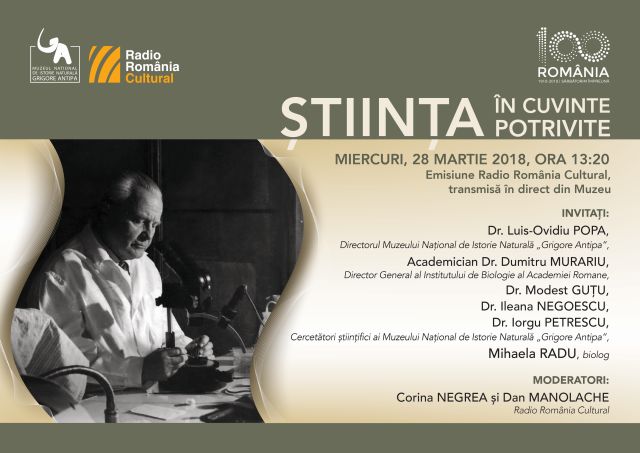 Muzeul Național de Istorie Naturală „Grigore Antipa” în parteneriat cu Radio România Cultural vă invită miercuri, 28 martie 2018 la emisiunea-dezbatere prilejuită de 110 ani de la nașterea marelui biolog român, Academicianul Mihai Băcescu (1908 – 1999).