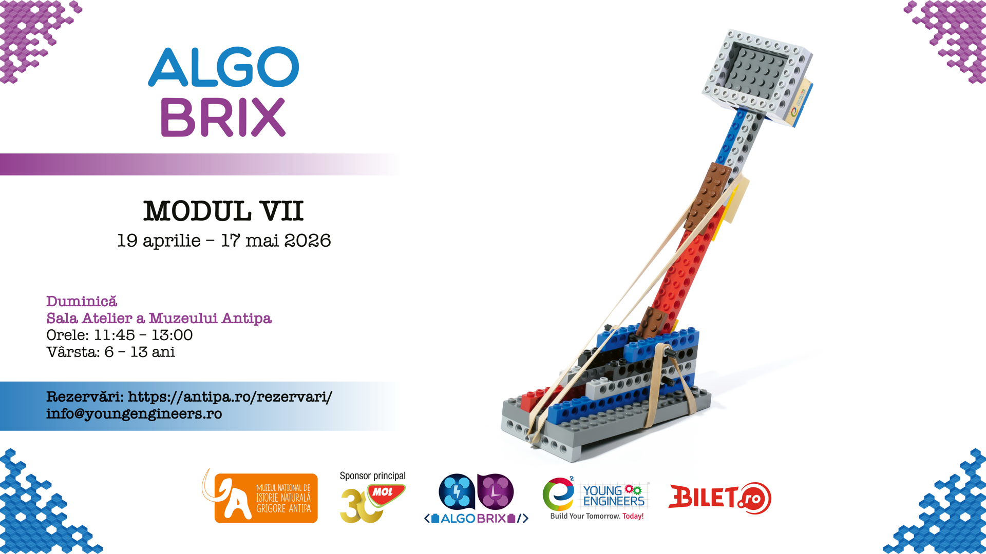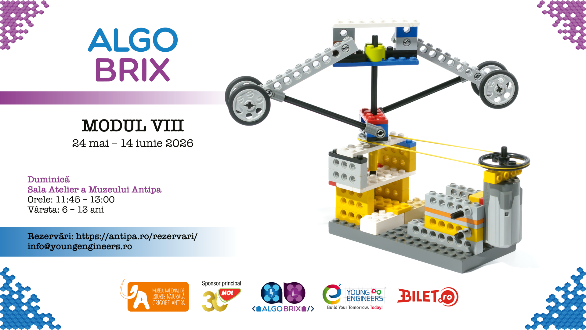 Tema 4 (14 iunie 2026): Lecție liberă – construcție din imaginație, programare, înmânarea diplomelor de Tânăr Inginer – Algo Bricks.