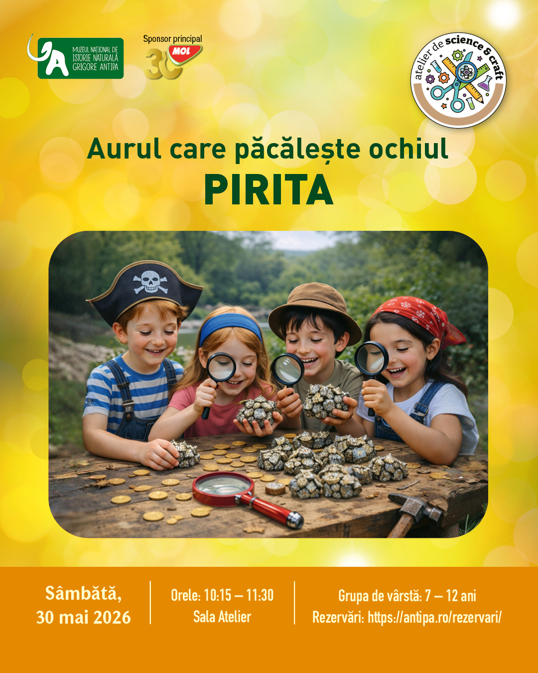 Muzeul Național de Istorie Naturală „Grigore Antipa” îi invită pe copiii curioși, sâmbătă, 30 mai 2026, să pornească într-o aventură fascinantă în lumea mineralelor, în cadrul atelierului creativ „Aurul care păcălește ochiul. Pirita”.