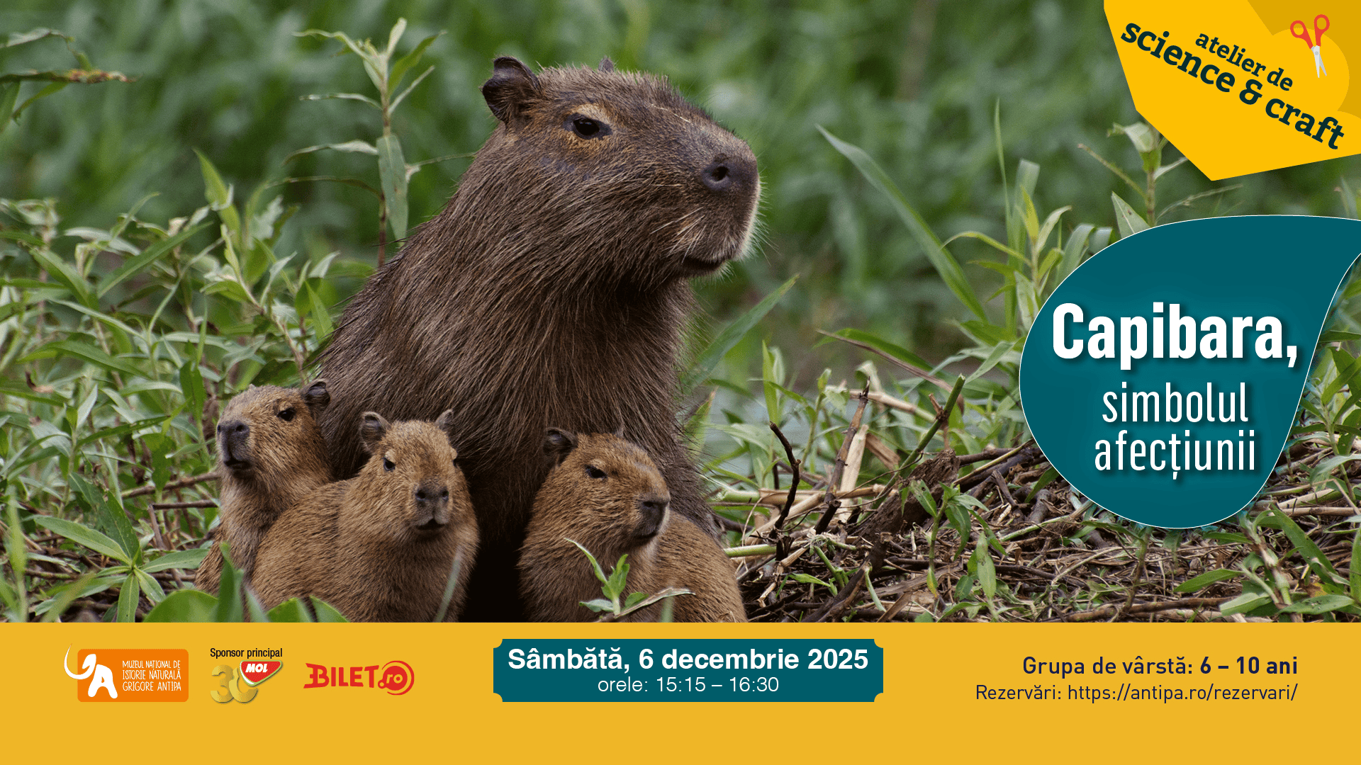 Sâmbătă, 6 decembrie 2025, copiii cu vârste între 6 și 10 ani sunt invitați să pornească într-o mini-expediție în jungla sud-americană, unde vor descoperi lucruri fascinante despre capibara, cel mai mare rozător din lume.