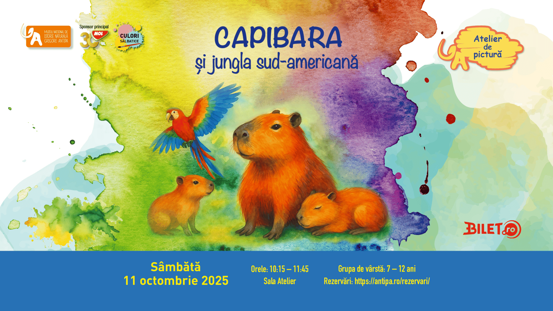 Muzeul Național de Istorie Naturală „Grigore Antipa” îi invită pe copiii pasionați de artă să descopere bucuria picturii în cadrul atelierului „Capibara și jungla sud-americană”. Acest atelier face parte din programul educativ și creativ „Culori sălbatice”.