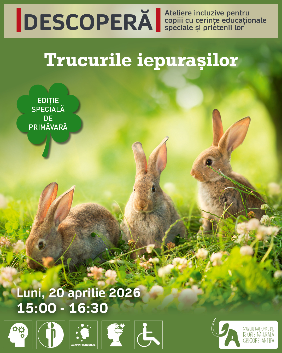 Muzeul Național de Istorie Naturală „Grigore Antipa” continuă, în luna aprilie 2026, seria de ateliere Descoperă, dedicată Trucurilor iepurașilor, adresată copiilor și tinerilor cu cerințe educaționale speciale.