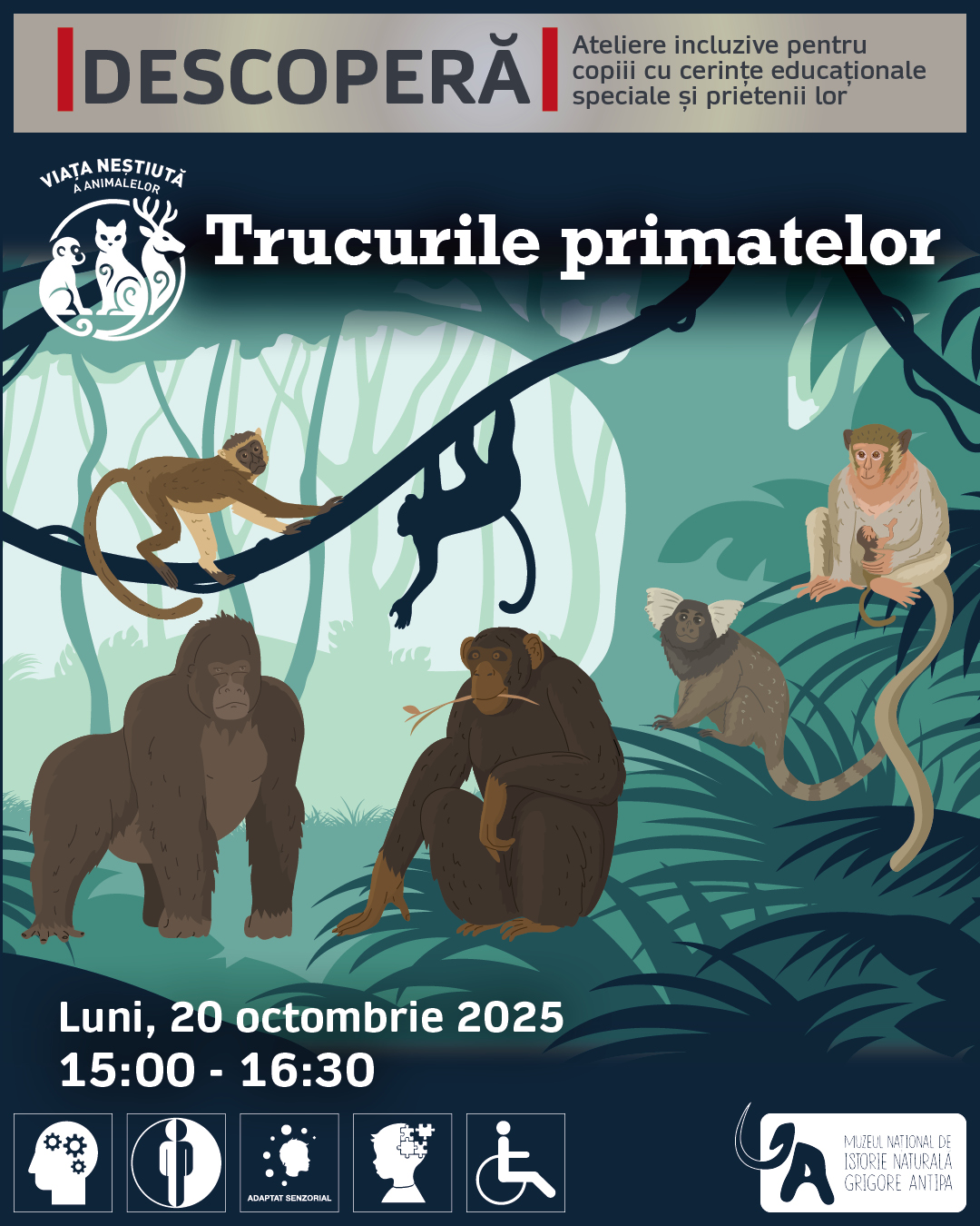 Primul atelier – Trucurile primatelor – va avea loc luni, 20 octombrie 2025, între orele 15.00-16.30, la sediul muzeului.
