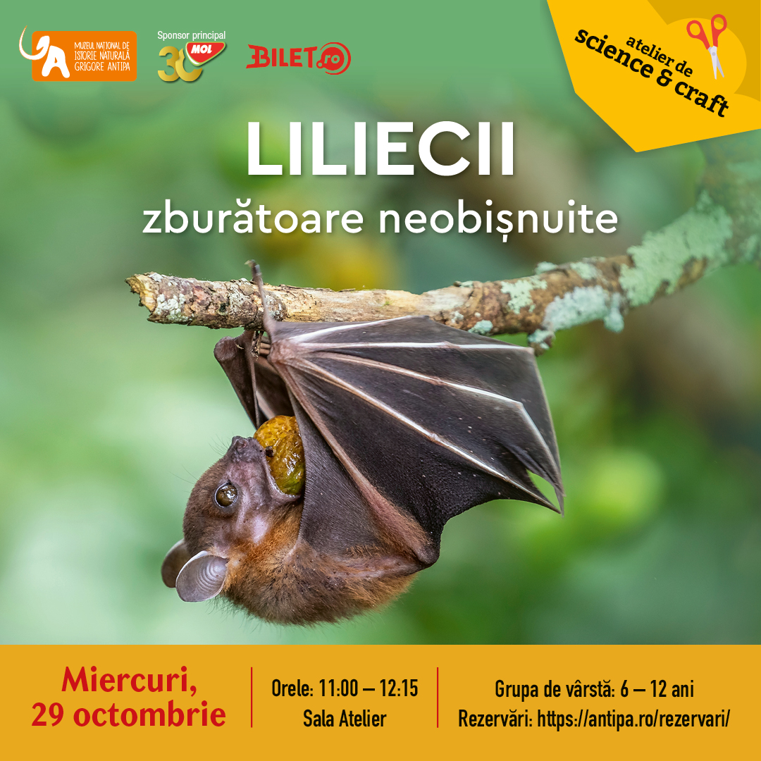 Muzeul Național de Istorie Naturală „Grigore Antipa” îi invită pe copiii cu vârste între 6 și 12 ani, miercuri, 29 octombrie 2025, între orele 11:00 – 12:15, la un atelier de science & craft dedicat liliecilor – aceste zburătoare neobișnuite!