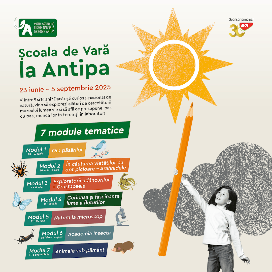 Înscrierea copiilor la Școala de Vară 2025 la Antipa se face prin formularul https://antipa.ro/rezervari , în limita locurilor disponibile.
